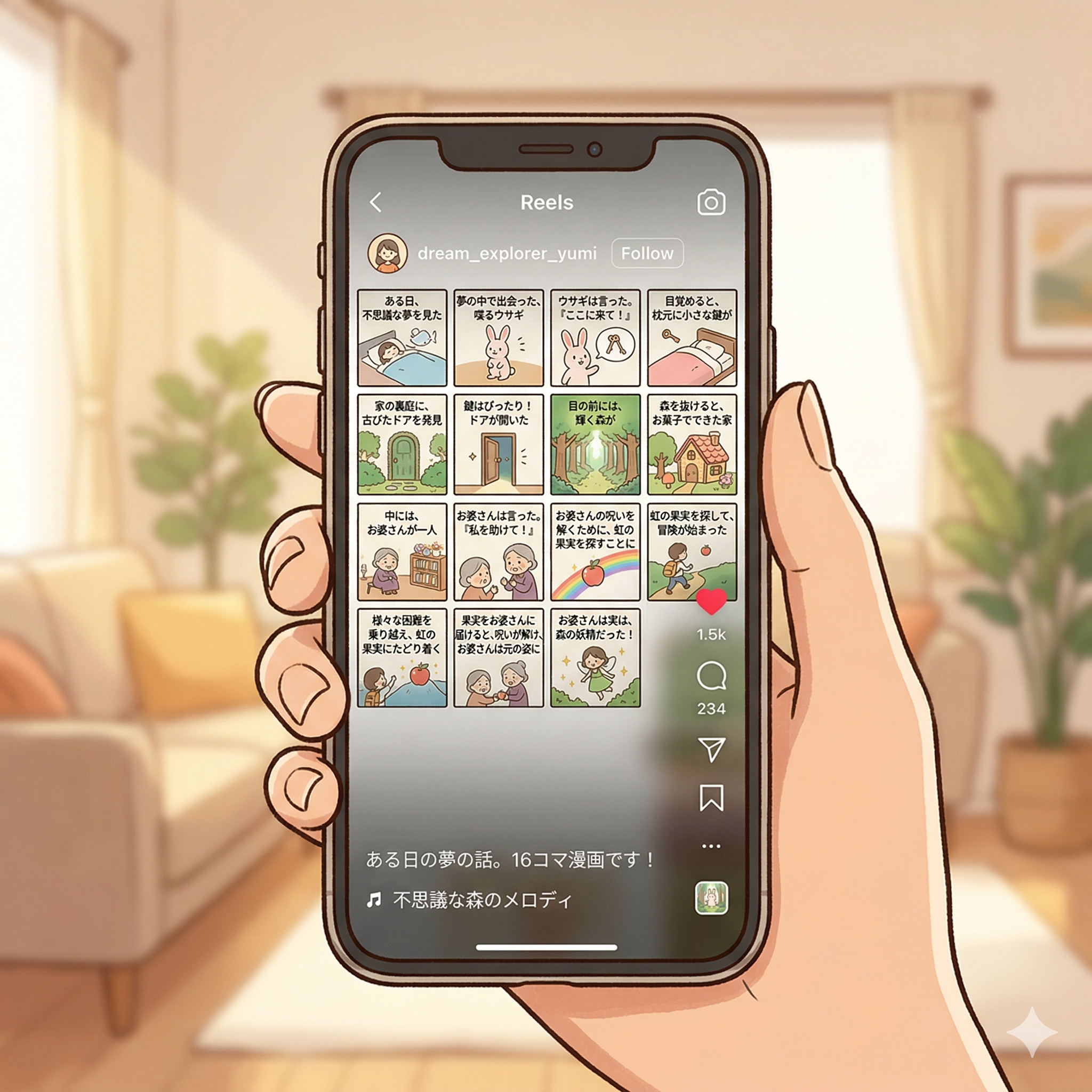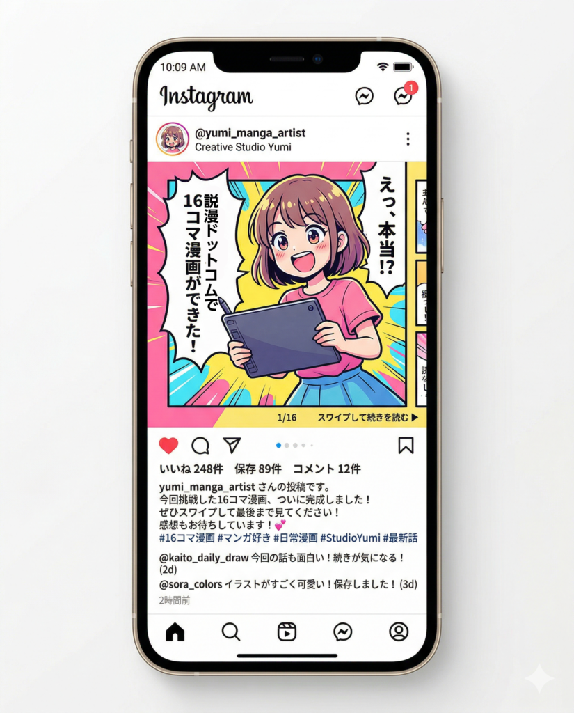Instagram・TikTok・YouTube Shortsに1分リール動画を投稿。16コマ漫画はカルーセル投稿にも最適。フォロワーの目に止まり、保存・シェアされやすいコンテンツに。