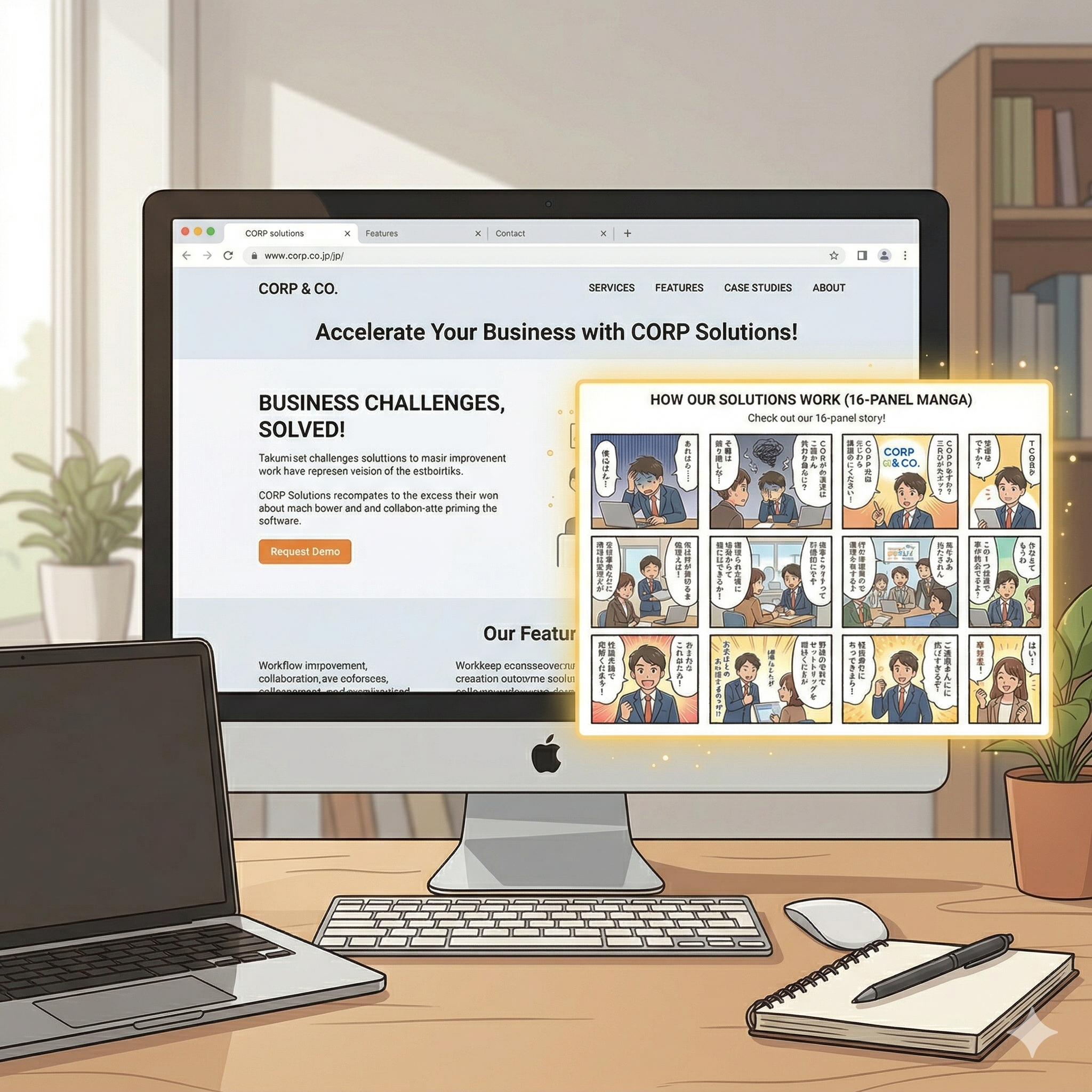 LPや商品ページに16コマ漫画を掲載。テキストだけでは伝わりにくい商品の魅力が、漫画のストーリーで直感的に伝わります。滞在時間アップにも効果的。